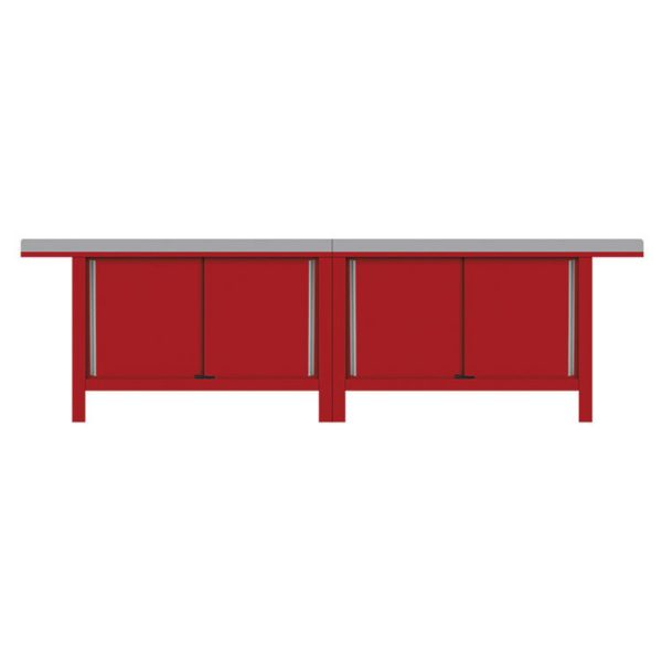 Painted Steel Top, Painted Steel Backstop, Left & Right Bench Top Overhang, (4) Sliding Doors, 120”W x 24”D x 34”H