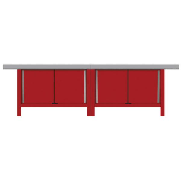 Stainless Steel Top, Painted Steel Backstop, Left & Right Bench Top Overhang, (4) Sliding Doors, 120”W x 24”D x 34”H
