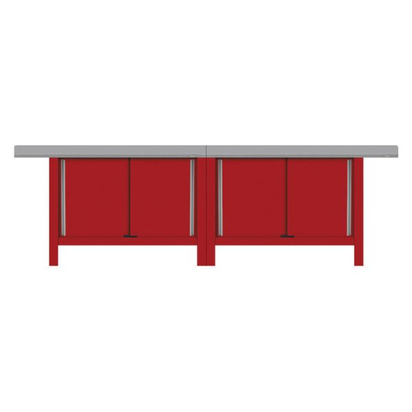 Stainless Steel Top, Painted Steel Backstop, Left & Right Bench Top Overhang, (4) Sliding Doors, 96”W x 24”D x 34”H