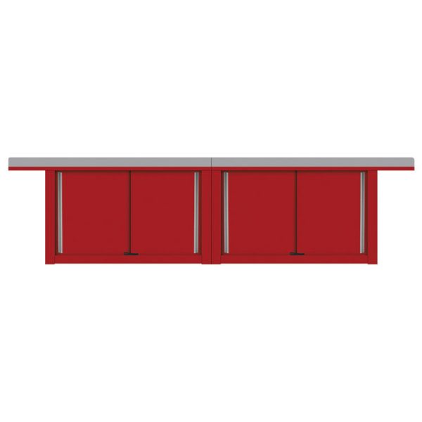 Painted Steel Top, Painted Steel Backstop, Left & Right Bench Top Overhang, (4) Sliding Doors, 96”W x 24”D x 27 1/2”H