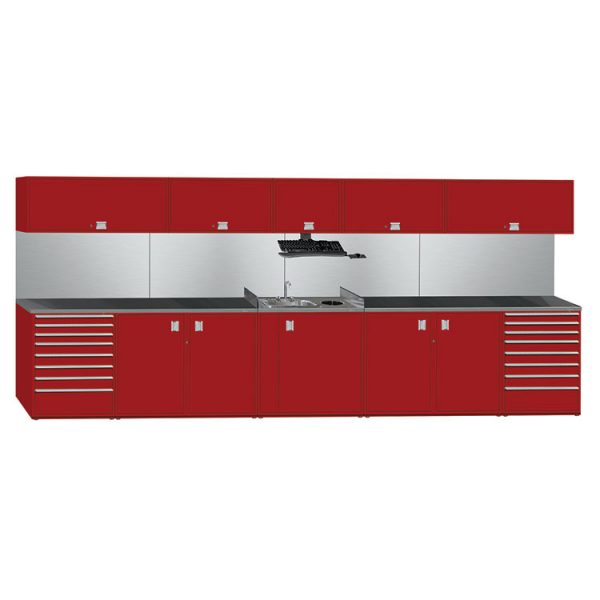 SHURETECH® Bench System Pre-Configured Workstation – 192″W Double Bay With Wall-Mounted Upper Cabinets (The “Keep It Clean”)