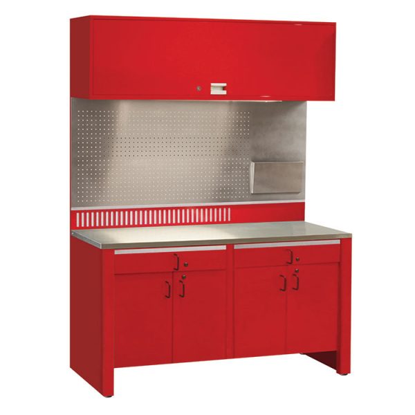 60”W Upper Storage Cabinet, Perforated Stainless Steel Tool Board With Work Order Holder, (2) Locking Drawers, (4) Locking Swing-Out Doors, Stainless Steel Top, Painted Steel Backstop, LED Task Light, Uprights, Backstop Accent Decal Available – Specify Color: Blue, Red, Orange Or Silver, Leg Levelers, 60”W x 26”D x 75”H