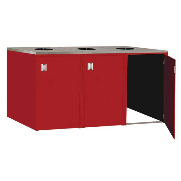 Stationary, (3) Stainless Steel Tops With 12” Receptacle Hole, Stainless Steel Bottom Ramp Supports, (3) Large Swing-Out Doors, Leg Levelers, 90″W x 27 3/4″D x 39 15/32″H