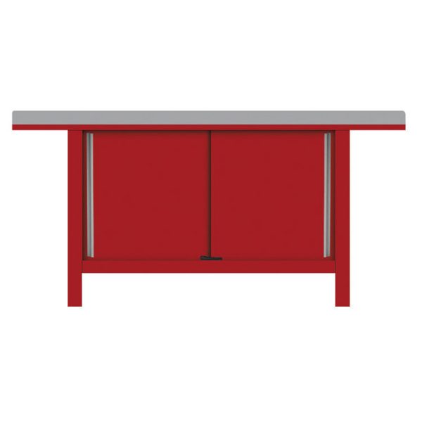 Painted Steel Top, Painted Steel Backstop, Left & Right Bench Top Overhang, (2) Sliding Doors, 72”W x 24”D x 34”H