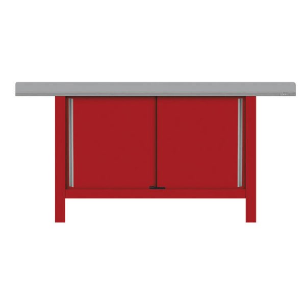 Stainless Steel Top, Painted Steel Backstop, Left & Right Bench Top Overhang, (2) Sliding Doors, 60”W x 24”D x 34”H
