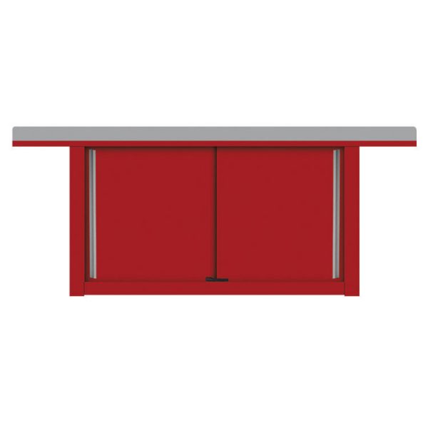 Painted Steel Top, Painted Steel Backstop, Left & Right Bench Top Overhang, (2) Sliding Doors, 72”W x 24”D x 27 1/2”H