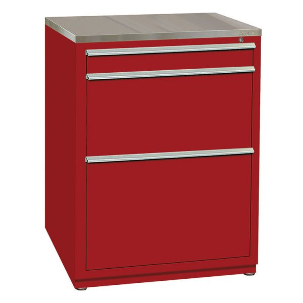 Stationary, Single Bank, (3) Full-Extension 400lb. Capacity Locking Drawers, Drawer Liners, Leg Levelers, Stainless Steel Over Wood Top Sold Separately, 29 1/4”W x 27 3/4”D x 38 5/16”H. Note: Dividers and partitions are sold separately.