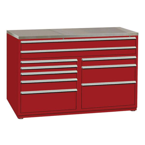 Stationary, Double Bank, (10) Full-Extension 400lb. Capacity Locking Drawers Including (2) Full-Width Top Drawer, Drawer Liners, Leg Levelers, Stainless Steel Over Wood Top Sold Separately, 58 5/16”W x 27 3/4”D x 42-7/16”H. Note: Dividers and partitions are sold separately.
