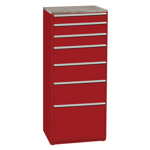 Stationary, Single Bank, (7) Full-Extension 400lb. Capacity Locking Drawers, Drawer Liners, Leg Levelers, Stainless Steel Over Wood Top Sold Separately, 29 1/4”W x 27 3/4”D x 60-15/16”H. Note: Dividers and partitions are sold separately.