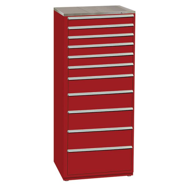 Stationary, Single Bank, (11) Full-Extension 400lb. Capacity Locking Drawers, Drawer Liners, Leg Levelers, Stainless Steel Over Wood Top Sold Separately, 29 1/4”W x 27 3/4”D x 60-15/16”H. Note: Dividers and partitions are sold separately.