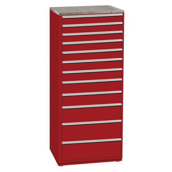 Stationary, Single Bank, (12) Full-Extension 400lb. Capacity Locking Drawers, Drawer Liners, Leg Levelers, Stainless Steel Over Wood Top Sold Separately, 29 1/4”W x 27 3/4”D x 60-15/16”H. Note: Dividers and partitions are sold separately.