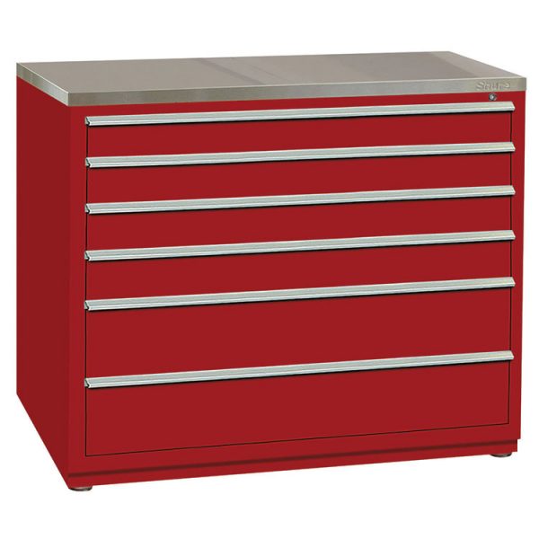 Stationary, Double Bank, (6) Full-Extension Full-Width, 400lb. Capacity Locking Drawers Including Drawer Liners, Leg Levelers, Stainless Steel Over Wood Top Sold Separately, 46”W x 27 3/4”D x 38 5/16”H. Note: Dividers and partitions are sold separately.